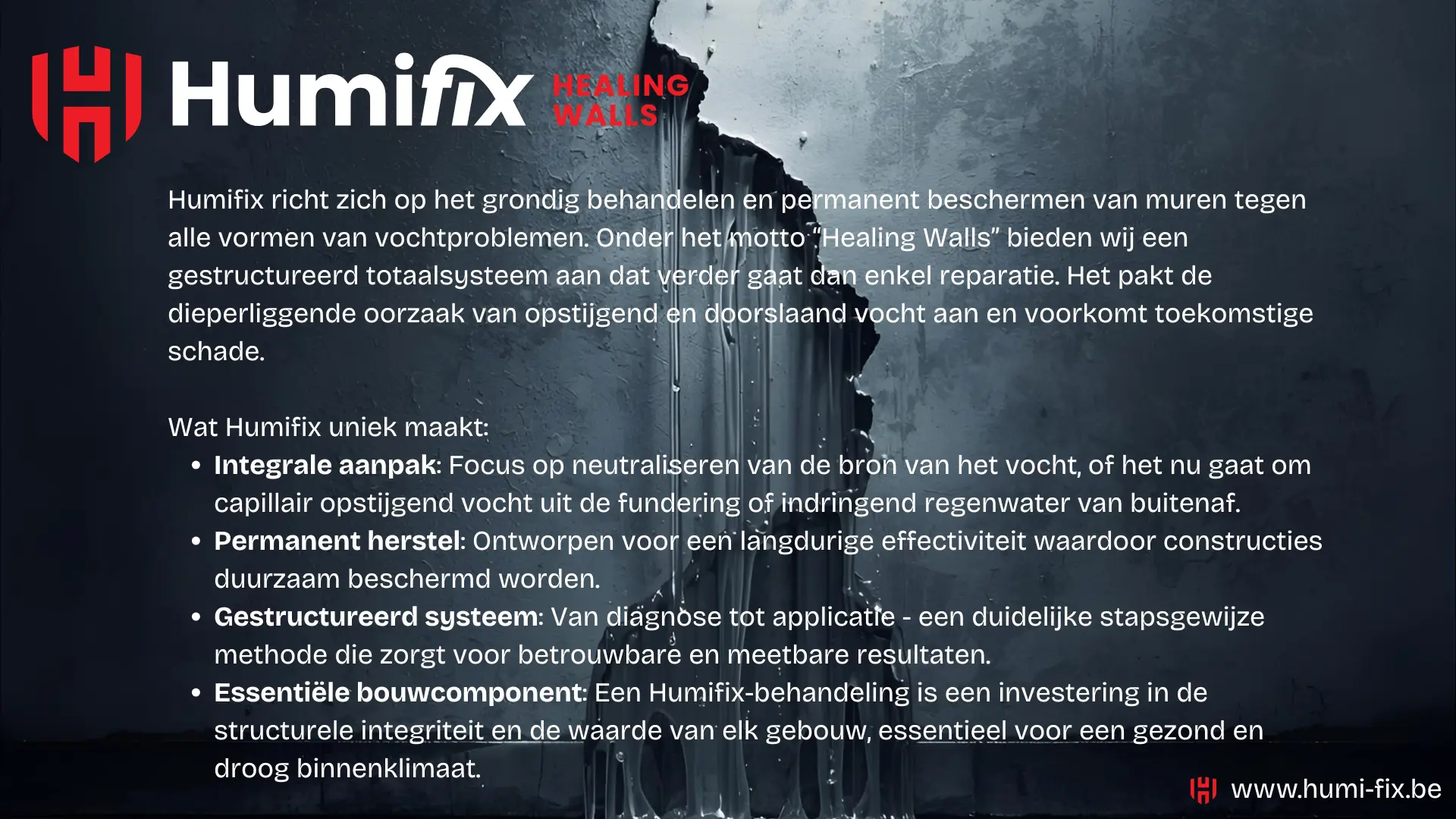 Met Humifix geeft u uw muren niet alleen een behandeling, maar een complete genezing, waardoor ze weer sterk, droog en gezond worden.